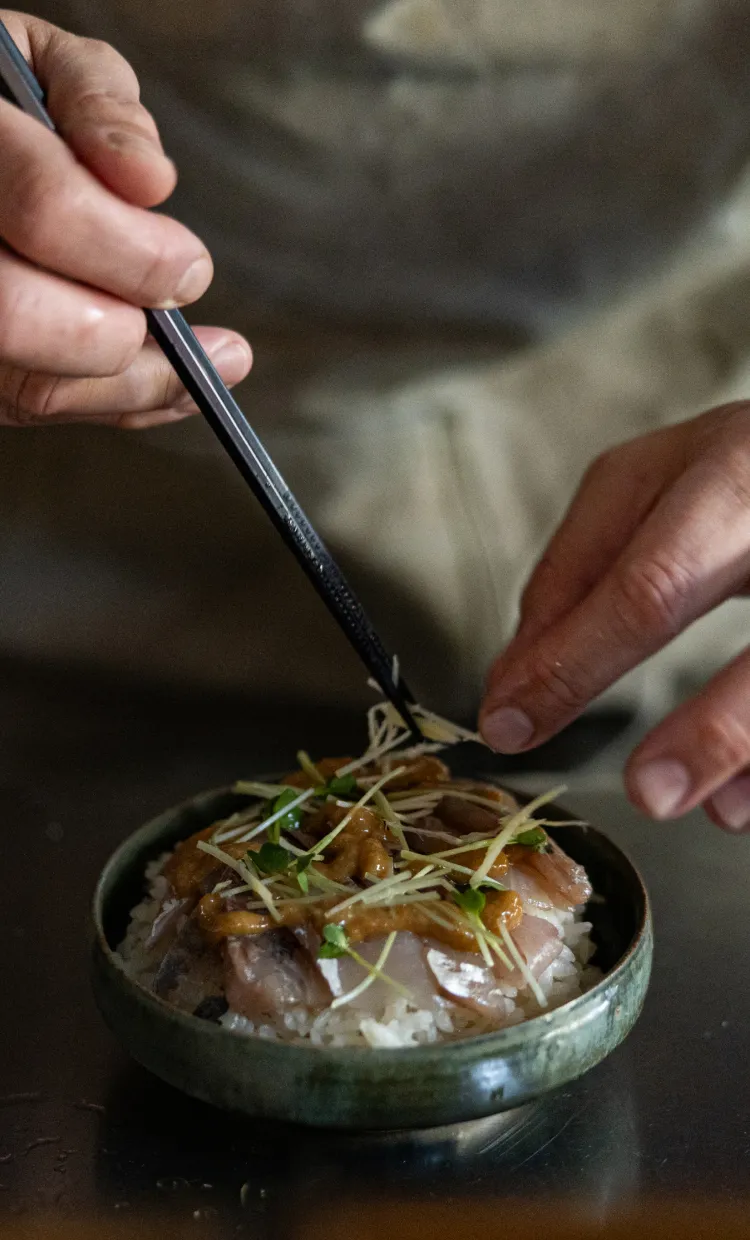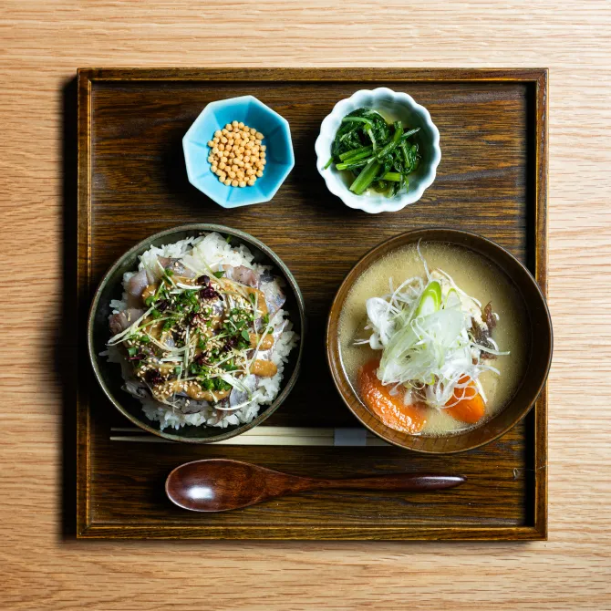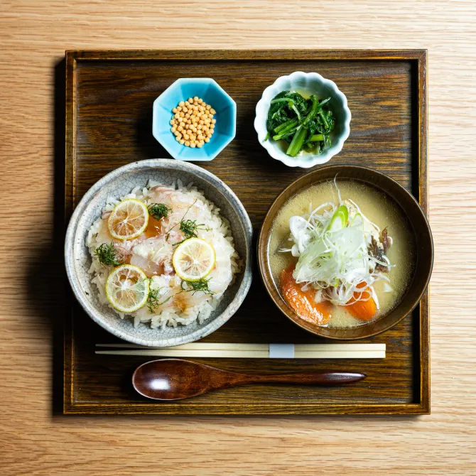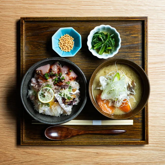 呼子の朝市と漁師町の食文化を一膳にまとめた、食材と出汁にこだわった朝市ごはんです。