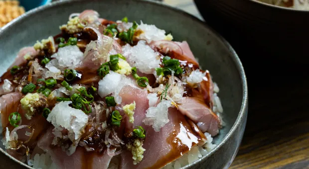最初は海鮮丼として。途中で出汁をかけ、茶漬けに。